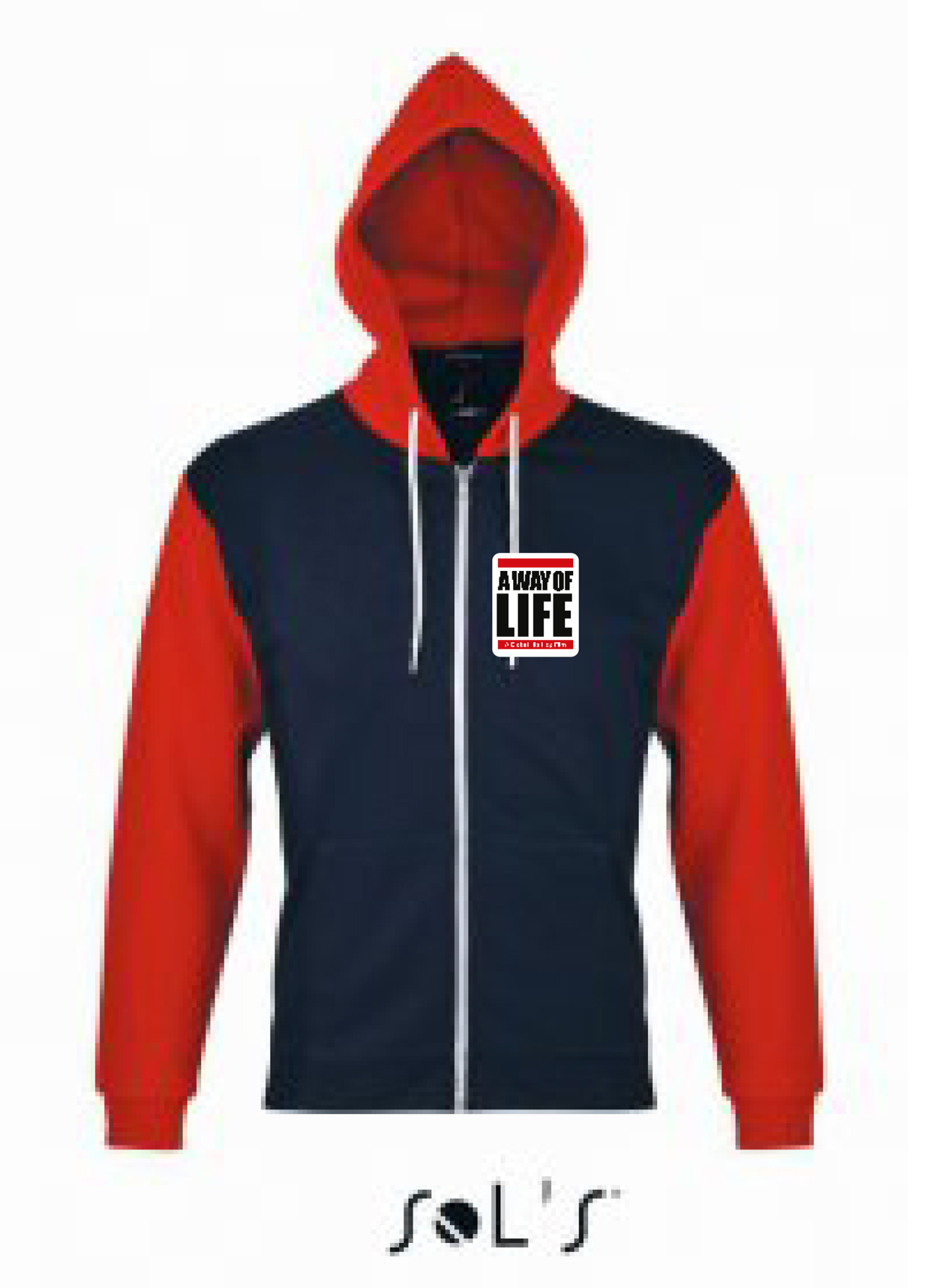 Drop shoulder style. Brushed fleece backing. Lined hood with white drawcord. Full length zip with white trim. Front pouch pockets. Ribbed cuffs and hem.